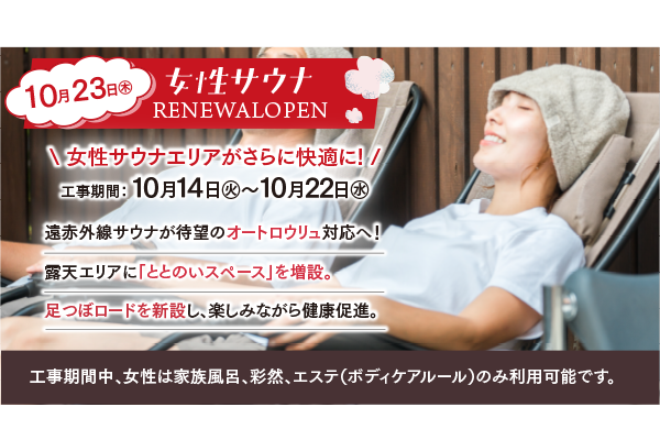 10月23日㊍より、女性サウナエリアが待望のリニューアルオープン!